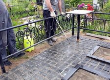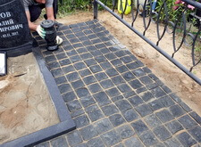 В заключении укладываем на территорию участка брусчатку, предварительно застелив место захоронения геотекстилем. Уложенные в периметр могилы плитки засыпаем пескобетонной смесь, позволяющей наиболее эффективно закрепить покрытие на земле.
