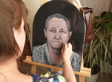 Сам же портрет наносится художником вручную. На приведённых ниже фото отображён поэтапный процесс рисования на граните: для начала камень покрывается специальной составом, затем медленно, начиная с одежды, вырисовываются детали. В заключении идёт углубление черт лица, так как без этого дополнения изображение на граните получится не реалистичным.