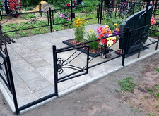 Изначальное состояние места захоронения – отсыпанный песком участок. Клиентку не устраивало подобное наземное покрытие: сложное в уборке и не очень привлекательное внешне. Заказчица пожелала заложить могилу бетонной плиткой, сохранив два цветника.