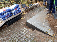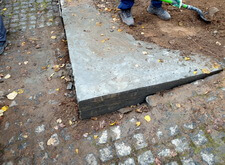 Далее мы приступили к работе над входным проёмом. Ранее он был оформлен горкой, однако мы предложили клиенту вариант с широкой ступенькой, который и был утверждён заказчиком. Для формирования ступеньки нам предстояло для начала демонтировать гранитную брусчатку.
