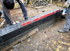 Параллельно с демонтажем наземного покрытия мы облицевали бетонный фундамент плитами из полированного чёрного гранита. Все работы выполнялись строго по уровню, а потому какие-либо перекосы или отклонения от нормы были абсолютно исключены.