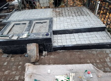 В ходе следующего этапа мы практически завершили работы с наземным покрытием: уложили всю территорию участка гранитной брусчаткой, а перед основаниями для новых памятников соорудили прямоугольные цветники, борта которых были выполнены из чёрного гранита.