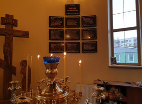 На момент нашего посещения, в храме уже находилась небольшая табличка – она была размещена неподалёку от креста и смотрелась композиция, прямо говоря, не лучшим образом. Надписи мелкие, практически не читаемые, да и сам мрамор, даже находясь в закрытом помещении, потускнел и утратил презентабельный вид.